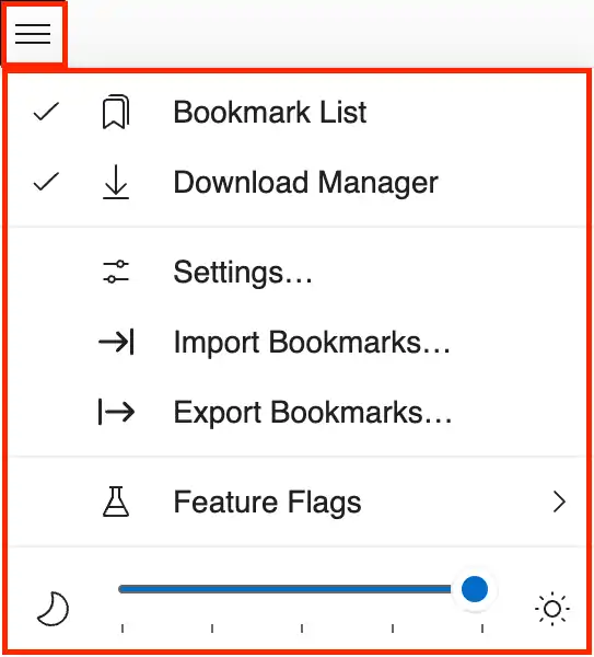 The menu contains entries to toggle the visibility of the Bookmark Panel and the Download Panel. The menu also provides an entry to open the Settings dialog. There additional entries to import and export bookmarks. This can either be used to migrate all bookmarks from the previous version of HakuNeko (legacy) or to backup and restore the current list of bookmarks to/from a file. At the bottom is a slider for setting the brightness (dark/light mode) of this frontend (does not affect the other frontends).