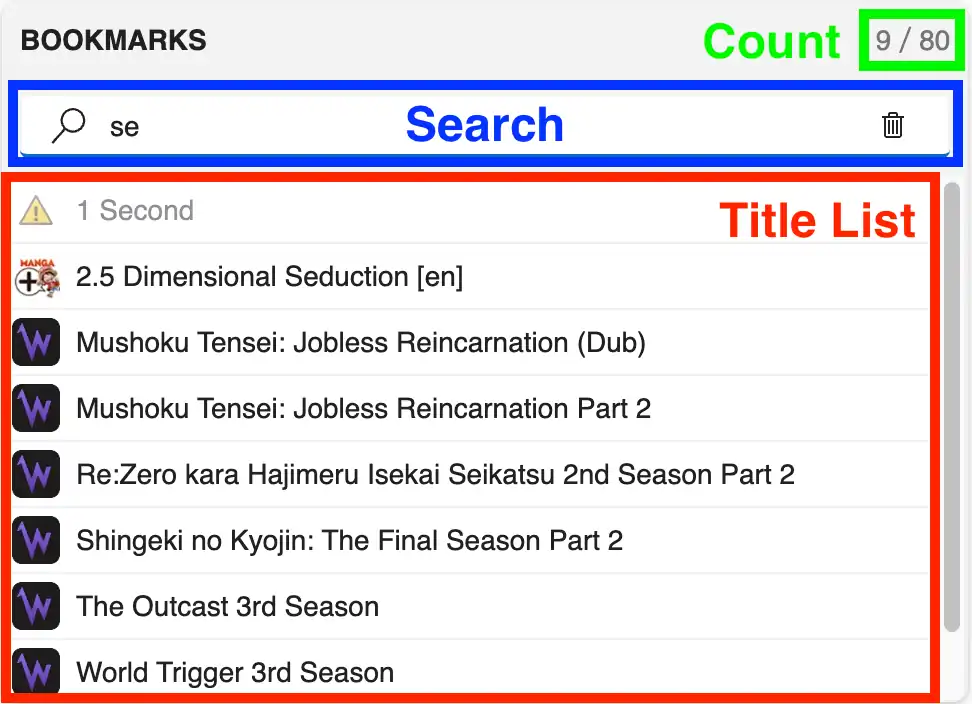 In expanded state it shows an addtiional list of the last synchronized titles and a search box. The search field supports a simple text input that can be entered by the user. The search field has options which can be toggled on or off. By turning on case sensitivity, the list is filtered by exactly matching the case of the entered text. By turning on regular expressions, the entered text is interpreted as regular expression (JS flavor) which is used to filter the list. Furthermore a clear button in the search box can be used to quickly reset the text input.