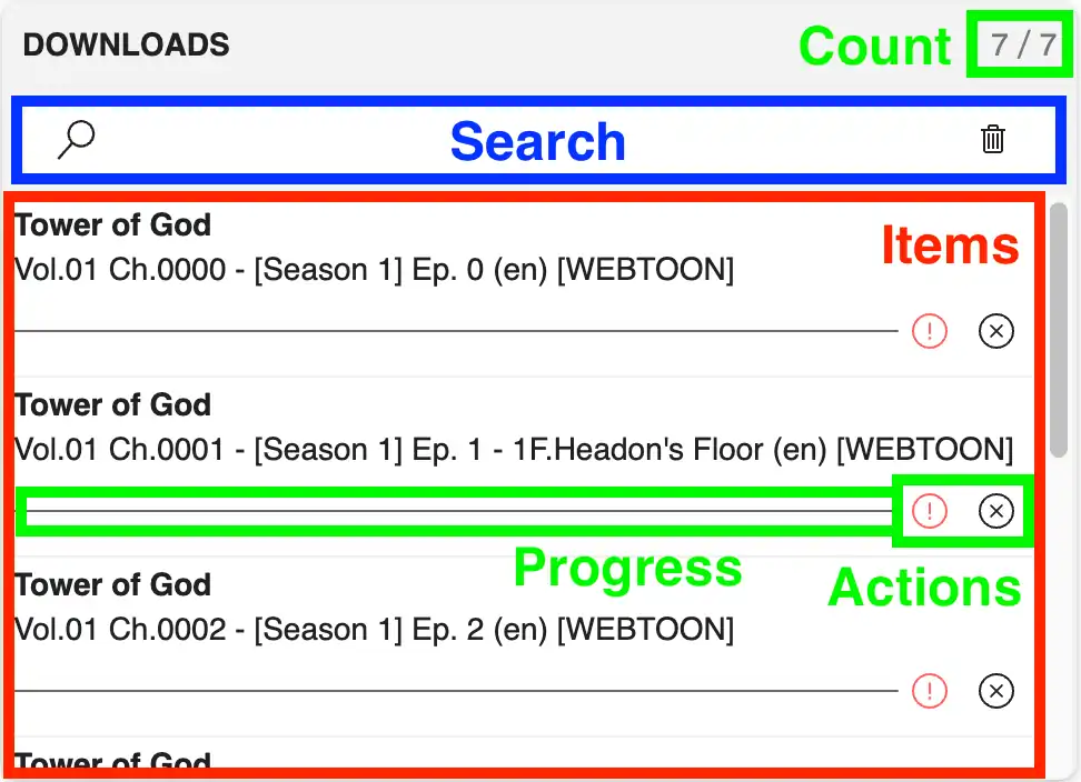 Each download features a progress bar and additional action. The first action represents the download status and may show any errors when clicked. The second action cancels and removes the download from the download manager.