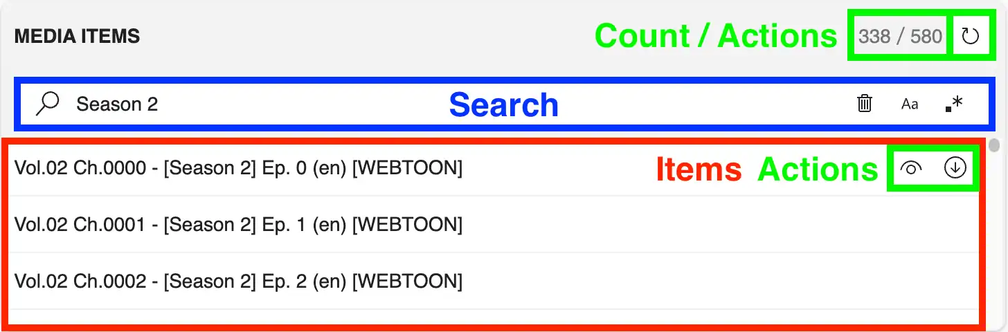 The header of this panel shows a counter and an action. The counter in the top right corner shows the number of media in this list and the number of media which are currently filtered by applying the search. Use the synchronize action to load the latest list of media for the selected title from the website. This needs to be done initially when the list of media is still empty.
