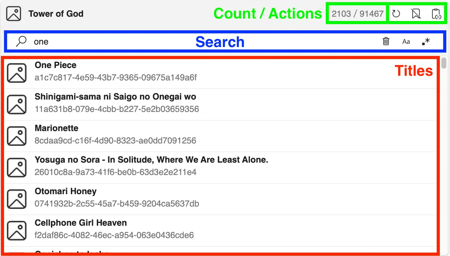 The purpose of this panel is to select a title (manga, anime) from a previously selected website. This is a collapsible panel that can be collapsed/expanded by clicking on the header.