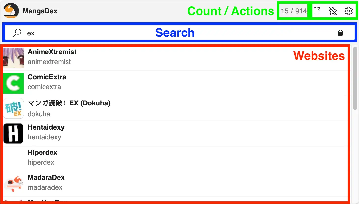 In collapsed state it shows the currently selected websites, a counter and some actions. The counter in the top right corner shows the number of websites in this list and the number of websites which are currently filtered by applying the search. The first action opens the URL of the website in a new HakuNeko window. Use this to browse the website, to check its availability (e.g., domain moved, region locked, ...) or to log in with a valid account. The star action can be used to mark this website as favorite. Each website may have individual settings such as timeouts and more, which can be changed by using the corresponding settings action.