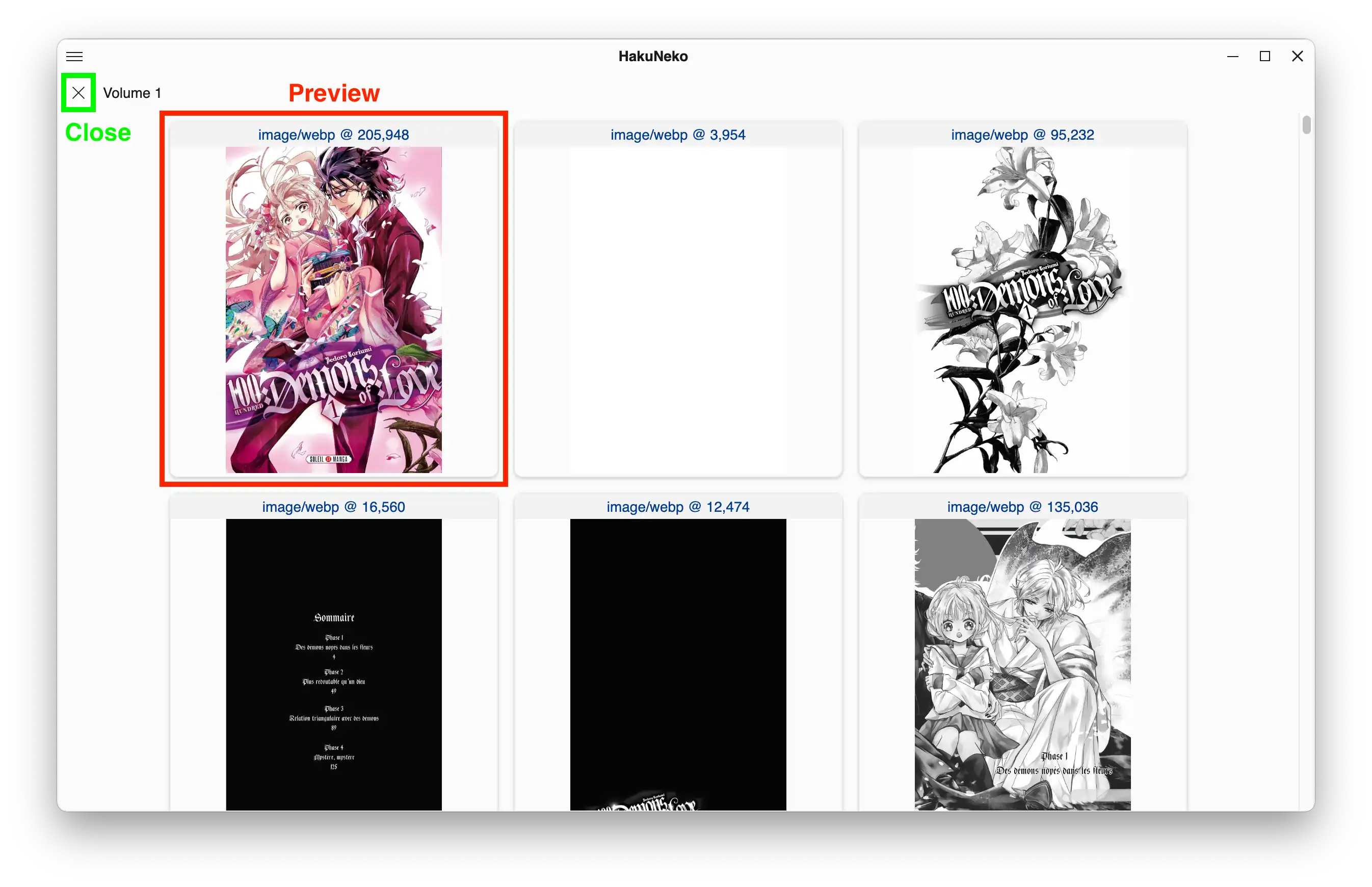 For a manga chapter it shows thumbnails of all chapter images. Each thumbnail contains the information of mime type and size and a small representation of the image. The information can be clicked to open the original image data in a separate window. The thumbnail image can be clicked to open the raw image data that was acquired by HakuNeko.